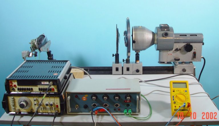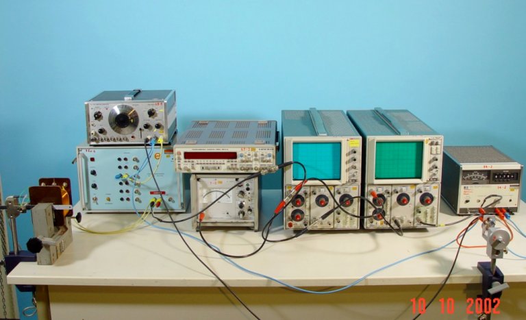 Versuchskarte BilderEin Federpendel schwingt mit etwa 15 Hz. Amplitude und Phase werden als Funktion der Frequenz gemessen und auf einem Oszilloskop dargestellt. Die Dämpfung kann variiert werden.
