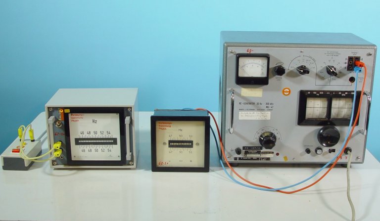 Messung einer Frequenz durch eine Reihe von schwingungsfähigen Metallzungen, deren Resonanz bei verschiedenen bekannten Frequenzen liegt.